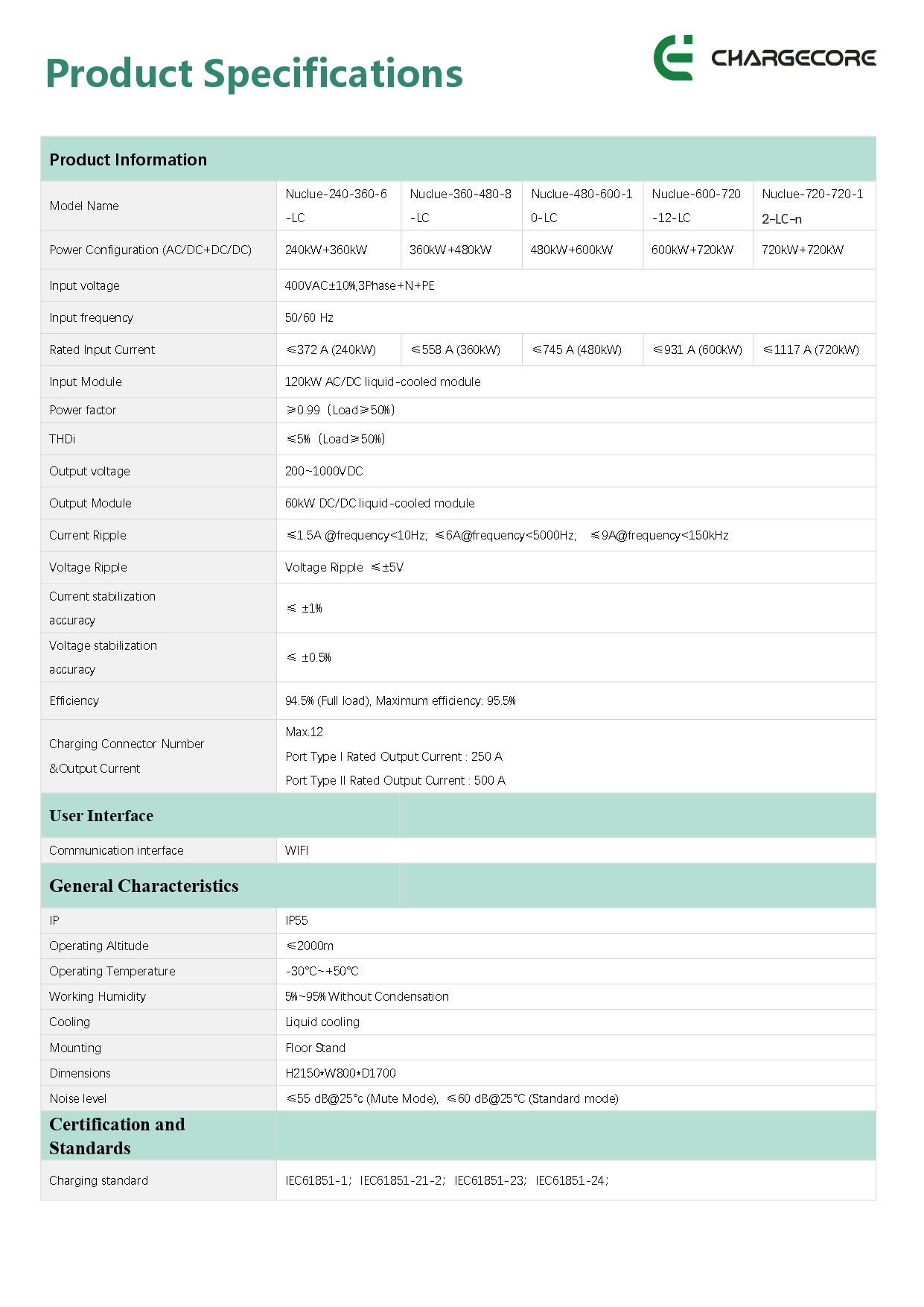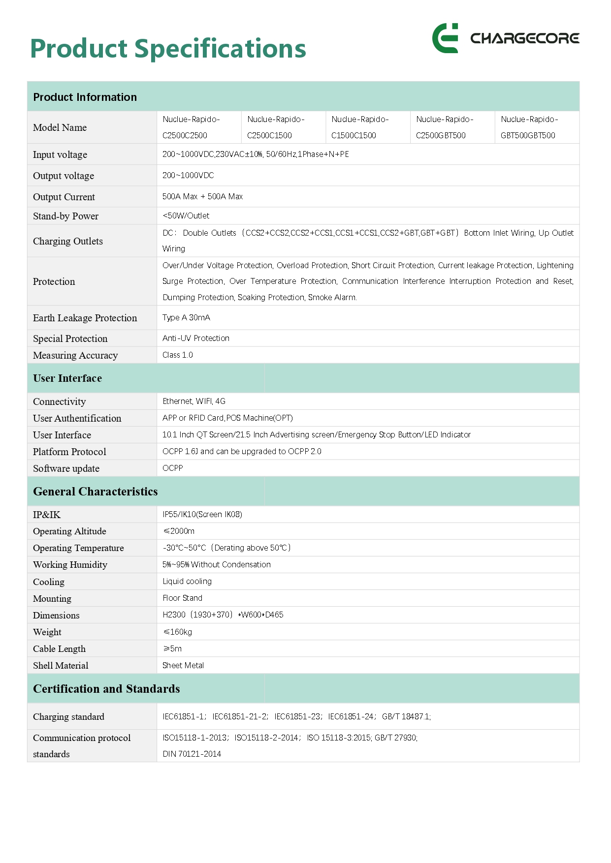 ChargeCore Nuclue-720-720-12-LC-n (n may be 0~6) (Power Cabinet), Nuclue-Rapido-C2500C2500 (Dispenser)